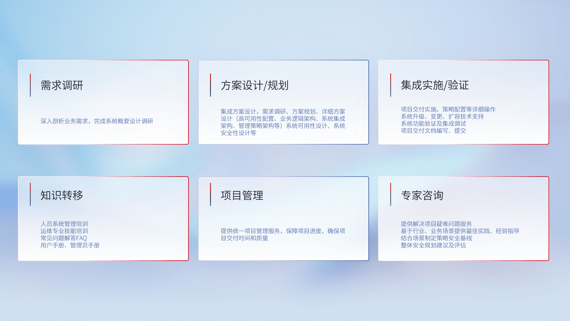 针对客户行业特性,,将宏观的安全战略和需求,,,,通过专业的交付服务,,实现项目落地,,为客户提供标准规范的集成交付服务。。。